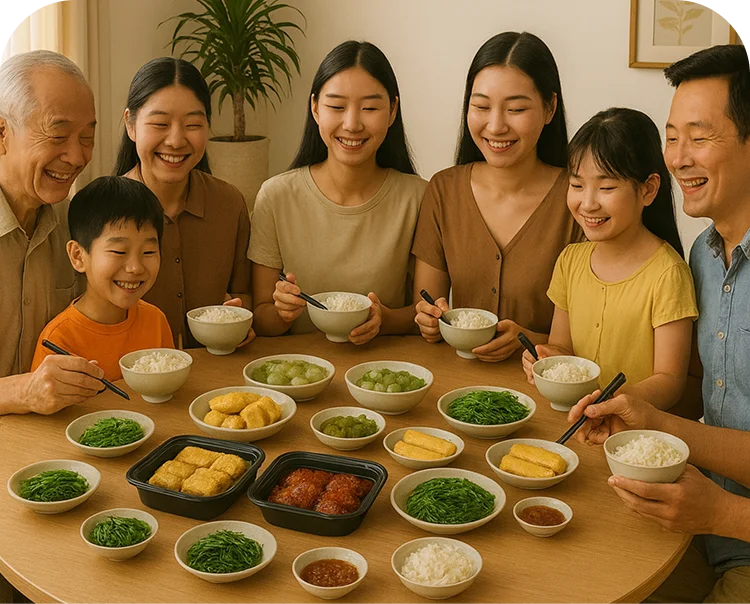 Mâm cơm sum vầy với 2 món chính từ Bữa ăn tiện lợi, kết hợp cùng hai món canh như canh cua mồng tơi hoặc canh dưa chua nấu sườn. Rau có thể đa dạng với su su xào và rau muống luộc chấm nước mắm gừng, thêm món phụ như đậu hũ chiên giòn hoặc trứng cuộn để bữa ăn thêm đầy đủ và trọn vị.